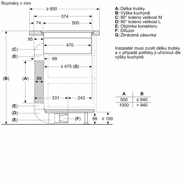 - - u provozu s částečně řízenou nebo neřízenou recirkulací musí být v oblasti soklu dodržen otvor pro zpětný tok vzduchu ≥ 400 cm². Otvor lze realizovat pomocí dekoračních mřížek, lamelových mřížek nebo jemně zkrácených soklů v závislosti na sortimentu výrobce kuchyňského nábytku.