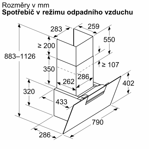 - rozměry spotřebiče pro odvětrávání (V x Š x H): 883-1126 x 790 x 433 mm