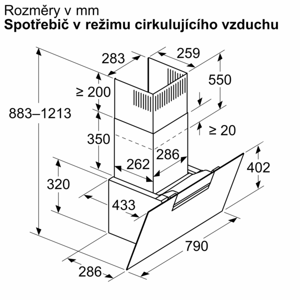 - rozměry spotřebiče pro recirkulaci (V x Š x H): 883-1213 x 790 x 433 mm