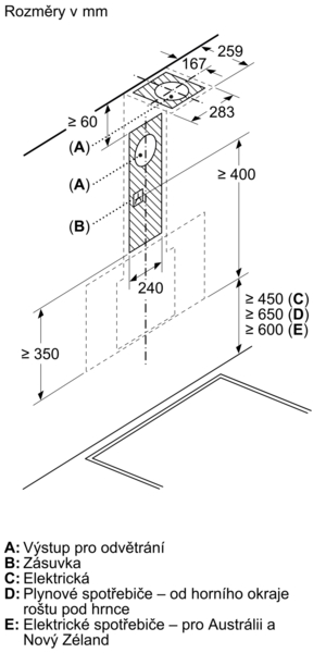 - Minimální vzdálenost nad plynovou varnou deskou 650 mm