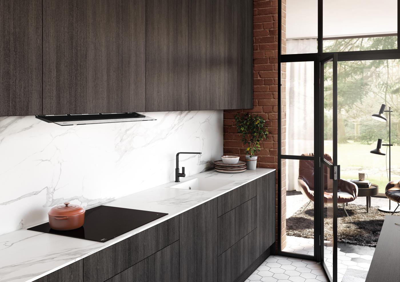 - Odsavač par Novy Fusion Pro je určen pro vestavbu do horní skříňky s hloubkou v rozmezí 310 - 351 mm. Jedná se o řešení odsavače s promyšlenými detaily pro snadné používání a zároveň pro ochranu nábytku před výpary z vaření. Díky průhlednému výklopnému skleněnému štítu se výrazně zvyšuje účinnost odsávání na předních varných zónách, štít zároveň chrání dvířka před poškozením vlhkostí. Po zaklopení štítu je odsavač z čelního pohledu prakticky neviditelný a nenarušuje design kuchyně. Odsavač se montuje namísto dna skříňky a veškeré jeho části jsou pokryty dekorativním antracitovým plechem. Vnitřek horní skříňky můžete využít například pro uskladnění kořenek nebo menších kousků nádobí. Čelní štít odsavače je zešikmený, takže můžete snadno otevřít i bezúchytková dvířka.