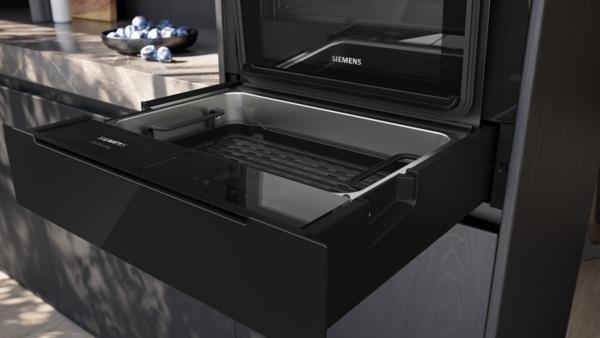 Objevte svobodu naplánovat si kuchyni přesně podle svých představ. Inovativní formát parní zásuvky umožňuje snadné umístění pod troubu, ať už v konfiguraci s výškou 60 cm nebo 45 cm, nebo dokonce jako jediný prvek pod pracovní deskou. Tak připravíte například křupavou pečeni v troubě a zároveň v jemné vodní páře zeleninu nebo brambory v naší nové parní zásuvce.